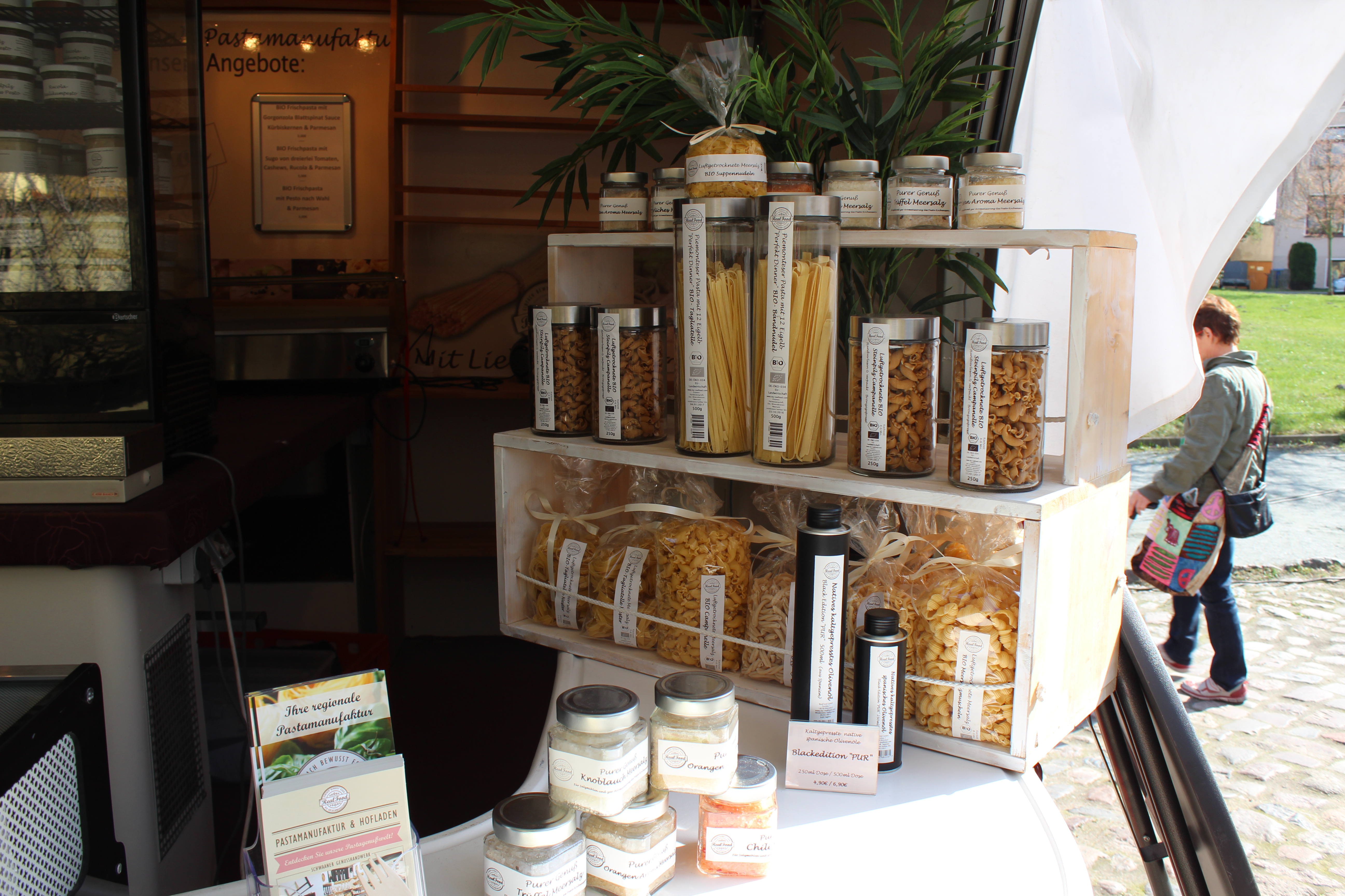 Nebenan steht die Fischräucherei Albatros der Familie Diederich. Der Rauch kommt schon aus dem Ofen gequollen. Die Fische hängen, einer neben dem anderen, im Ofen. Für die Schwestern Diederich ist es eine Umstellung, den Markt so spät zu beginnen und dafür erst um 19 Uhr zu beenden. Eine Besonderheit ist der Stand der Pastamanufaktur aus Niendorf. Es werden Nudeln in allen Größen und Formen angeboten. Die dazu passenden Öle, Pesto und Kräuter können auch passend zu der Pasta erworben werden. Die Manufaktur setzt auf BIO-Qualität und hat ihren Wagen mit all den italienischen Köstlichkeiten arrangiert.