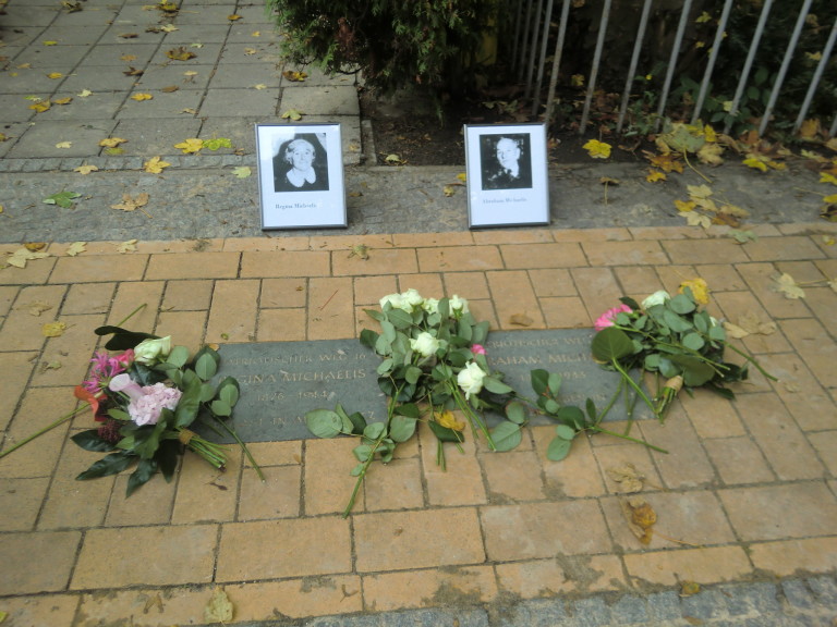 Die Steine wurden im Beisein der Enkelin und Urenkelin eingeweiht und sollen an die Juden und KZ-Opfer Regina und Abraham Michaelis erinnern. Das Paar wurde von den Nazis in den Lagern Theresienstadt und Auschwitz ermordet.