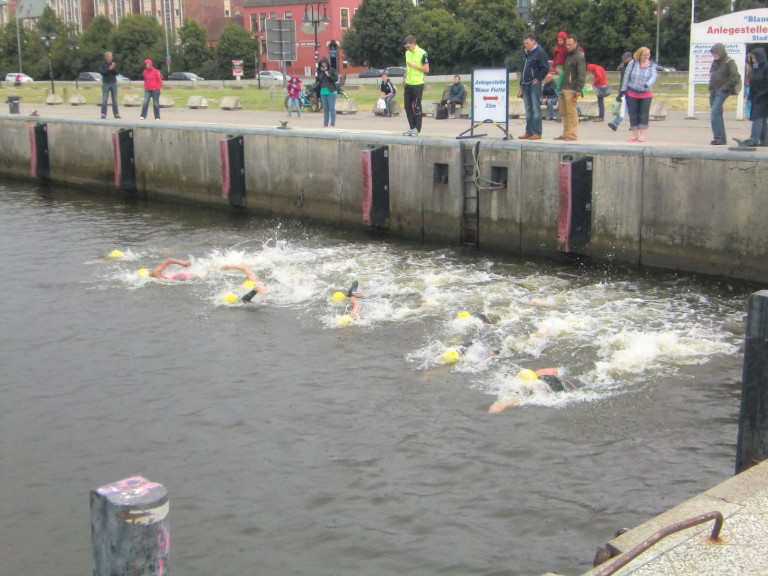 Knapp 40 Teilnehmer zählte der 1. Swin & Run am Samstag im Rostocker Stadthafen. Den Sieg auf der Langstrecke sicherte sich Lokalmatador Dennis Weu.
