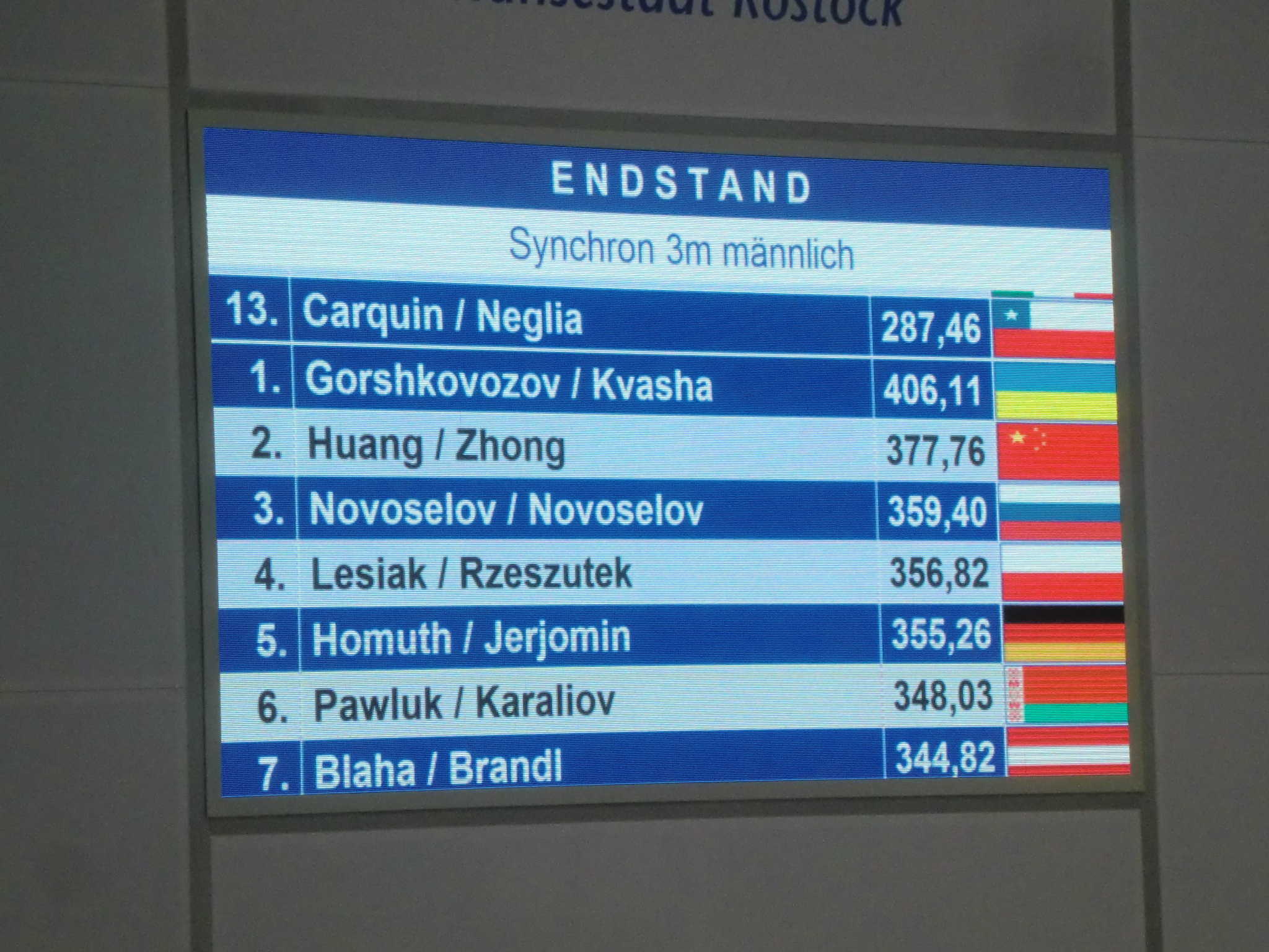 Etwas enttäuscht zeigte sich das Synchronpaar Maxim Jerjomin (Rostock) & Oliver Homuth (Berlin) – der avisierte Podestplatz vom 3 Meter Brett blieb aus, es reichte nur zum fünften Rang. Gold holten sich souverän die Ukrainer Ilja Kvasha/ Alexandr Gorshkovosov. Silber ging an China, Bronze an Russland.